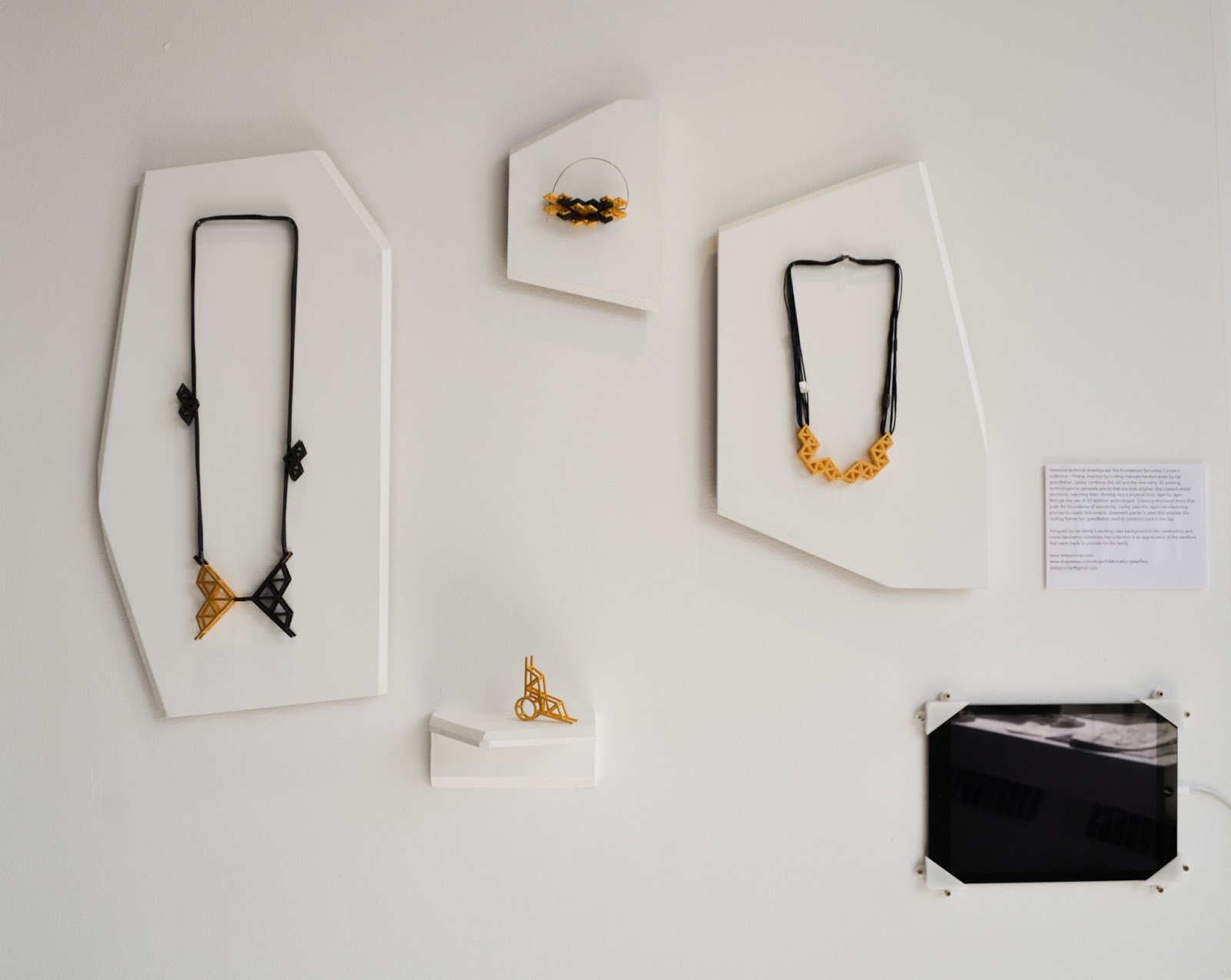 I attended the show on opening night to celebrate with the new graduates in amongst the excited and very hectic atmosphere within the college buildings. This years jewellery show was held in what is normally an animation classroom, although for the show it was much better lit than normal when animation students are huddled over light boxes busily creating animation sequences. The displays were professionally set out and really showed off the students work. Every year the jewellery department stands out as one of the best exhibitions in the college and this year was no exception. There was a wide range of work on show, from traditional metal based jewellery to contemporary ceramics, there was definitely something for everyone.